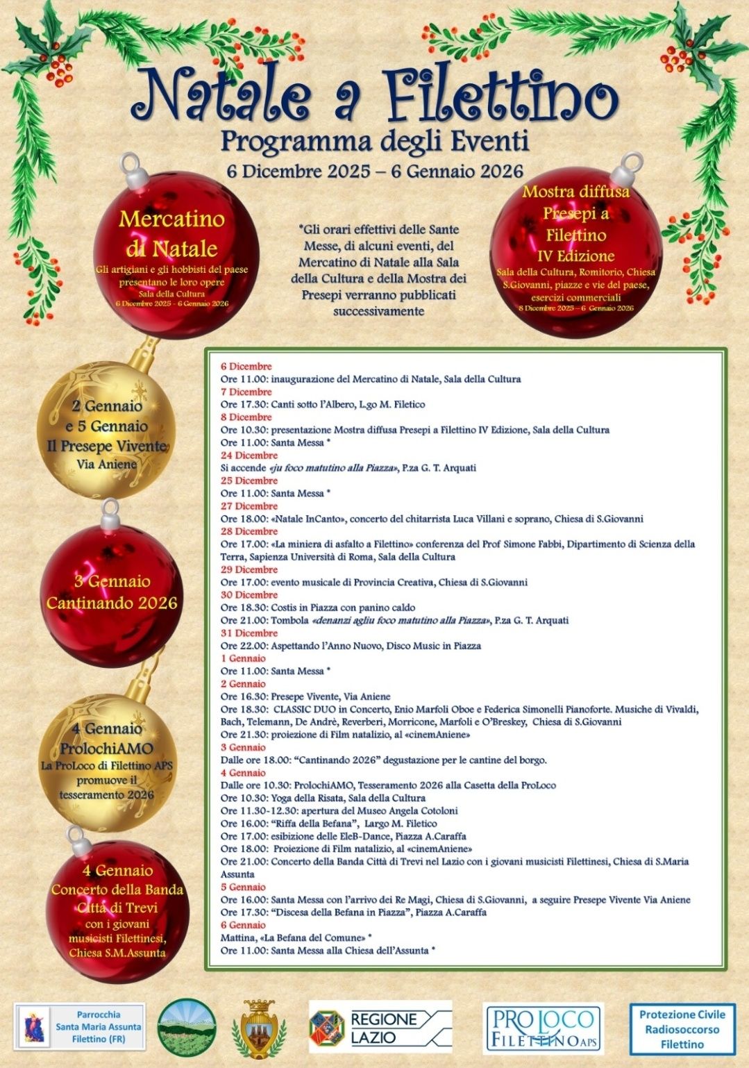 Ore 10:30 - Yoga della Risata | Sala della Cultura Ore 11:30 - 12:30 - Apertura del museo "Angela Cotoloni" Ore 16:00 - Riffa della Befana | L.go M. Filetico Ore 17:00 - Esibizione delle EleB Dance | P.zza A. Caraffa Ore 18:00 - Proiezione di film natalizio, "cinemAniene" Ore 21:00 - Concerto della Banda Città di Trevi nel Lazio con i giovani musicisti filettinesi | Chiesa di S. Maria Assunta |